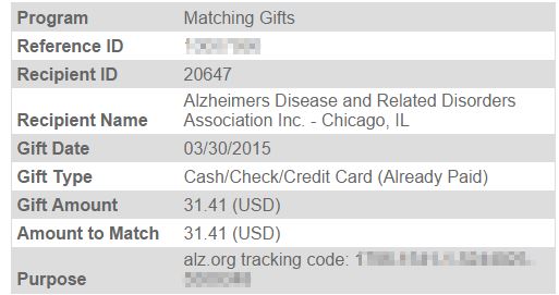 Below is my personal donation along with VMware’s matching gift. $31.41 is the minimum donation to receive a matching gift with VMware’s matching program.  alz-donation alz-matching