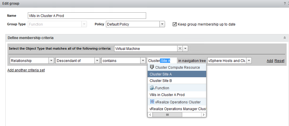 We name the group “VMs in Cluster A Prod”, pick a Group Type of “Function”, and for now pick the Default Policy. There are various group types – in this case we are separating the VMs based on function (Critical Prod). We check the Keep group membership up to date box. This ensures that new VMs added to the cluster get picked up by the group.