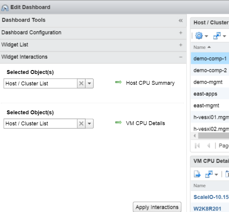 Finally, we modify the Widget interactions. When we select a host or cluster object in the Host / Cluster list box, we want it to change the two view boxes. We configure the Widget Interactions to use the Host / Cluster List selection as the data source, and we have it feed the Host CPU Summary and VM CPU Details view boxes. Click Apply Interactions to save the interactions.