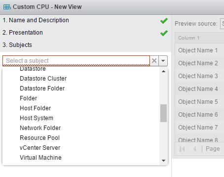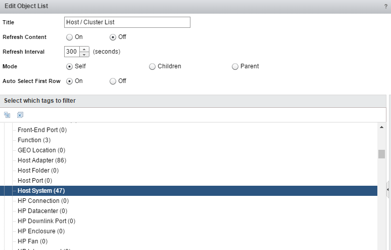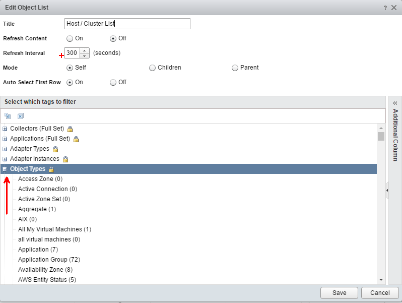 We name the Object List. We only want vSphere Hosts and Clusters showing up, so we expand the Object Types option.