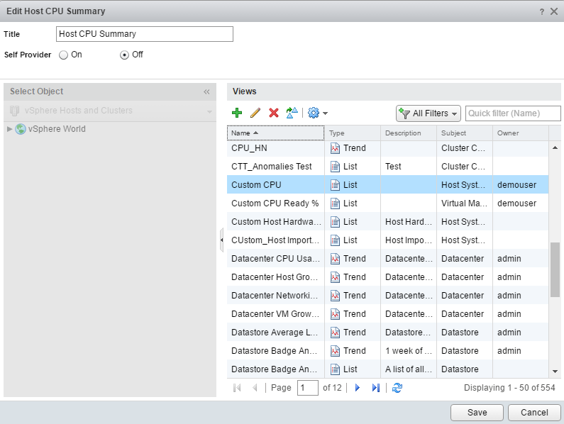 Now, we edit the View widget on the top right. We name it Host CPU Summary, then pick our Custom CPU view that we created at the beginning of this post.