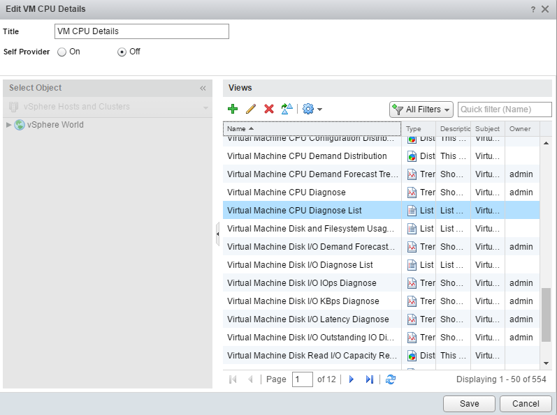 We edit the bottom left view widget. We name it VM CPU Details, and we pick a standard view called Virtual Machine CPU Diagnose List.
