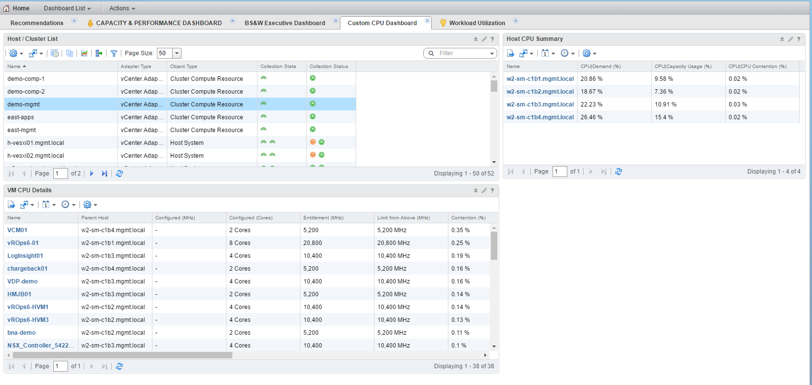 In our completed dashboard, we click on the demo-mgmt Cluster. All of the hosts in the cluster show up in the Host CPU Summary box. All of the VMs in the cluster show up in the VM CPU Details box.