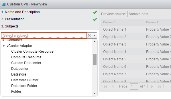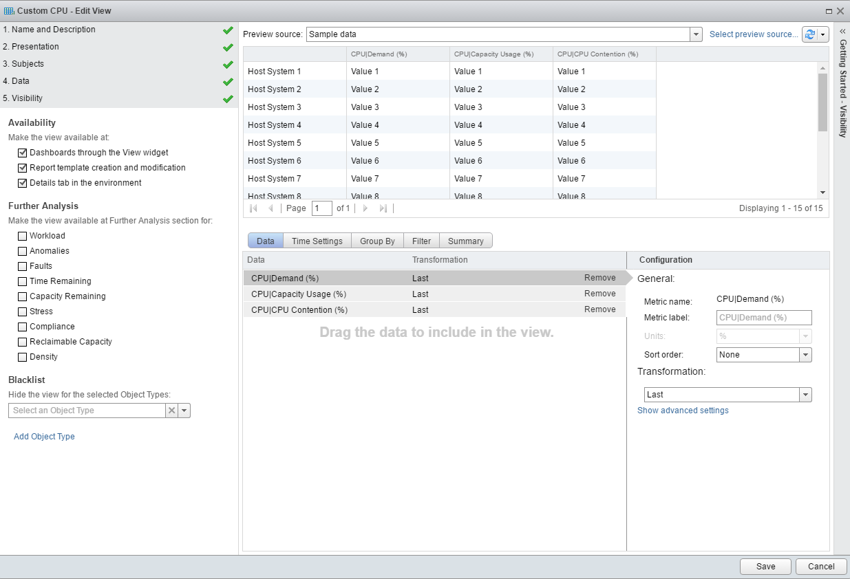First, we want to create a new custom view for the host CPU metrics. There are many out-of-the-box views inside vROps – you can use any of them, or create your own. We will see both methods in this post – a custom view for the host metrics, and an out-of-the-box view for the VM metrics.