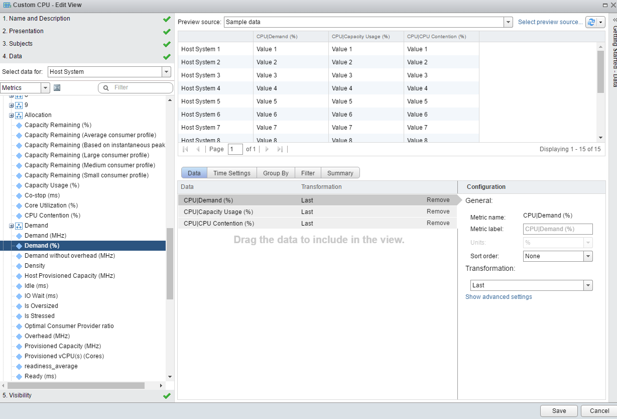 We want 3 host metrics to show. CPU Demand will show me how much CPU the VMs on the host are demanding. CPU Capacity Usage will show me how much CPU is actually used. CPU Demand can be higher than CPU Capacity Used due to limits, either directly on the VM or imposed by resource pools. There are resource pool limits in this test environment, so we might expect to see higher CPU demand than usage. The final metric we want is CPU Contention. We drag them from the metrics on the right to the include box in the middle.