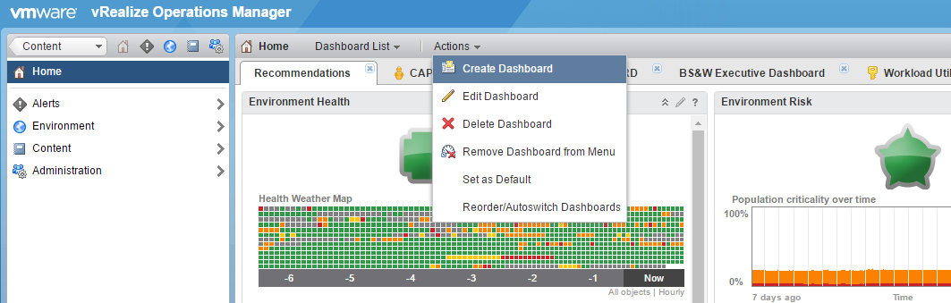 Now we create a new dashboard from the Home screen, click on Actions, then Create Dashboard.