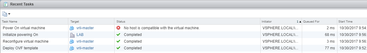 The deployment failed because it wants to put 16 vCPU on my LI VM, but my little lab only has 4 cores per host. The vCenter error said “No host is compatible with the virtual machine.” All I had to do was edit the deployed VM, change it to two cores (I also decreased the RAM), power it on and the LCM deployment continued without issue.